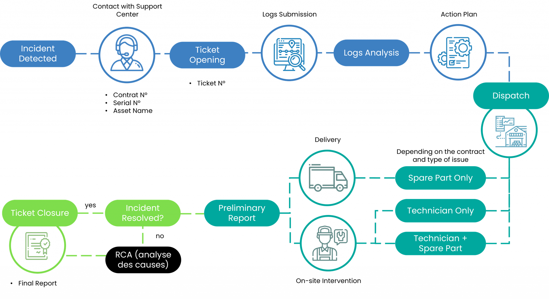 This offer combines our diagnostic expertise with complete spare parts management. It’s ideal for clients who perform their own on-site interventions but need support both in understanding failures and in the immediate availability of spares. You open a ticket, we analyse, we define the action, and we make tested parts available so your teams can intervene without delay.